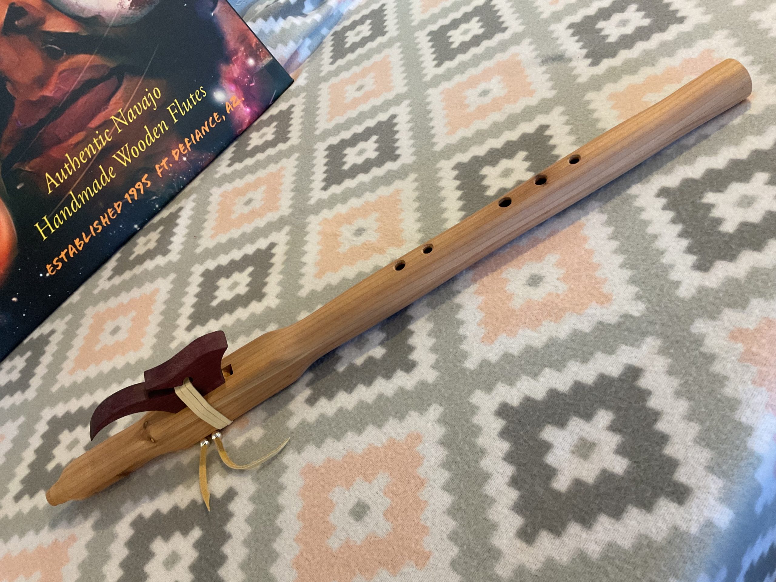 - 24” traditional 5 hole style flute made of aromatic cedar with a Purple Heart reed piece.