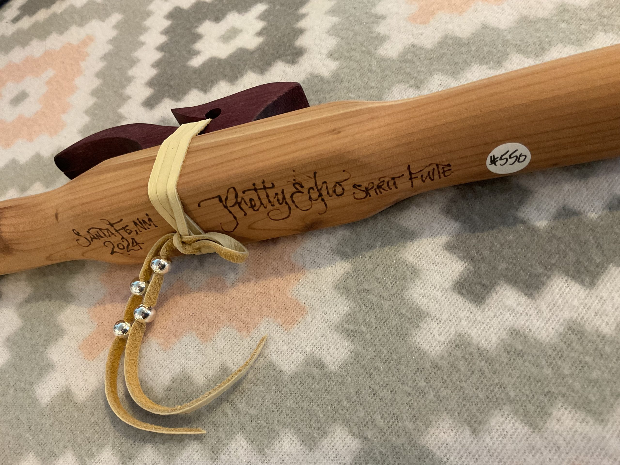 This is a replica of the very flute I consider my favorite in my own collection. Made of aromatic cedar with a Purple Heart reed piece tied down with deerskin lace and adorned with silver plated beads. It measures approximately 24” in length with the finger holes made for someone with a longer reach to comfortably cover finger holes. I left this flute plain and with an acrylic coating for a true vibration. The frequency of this flute is made to resonate, what I refer to as, an “indigenous/ancestral” vibration. Representing a Native American connection compared to the Celtic/European sway of a 6 hole flute. I made this flute by hand and shaped it so that the sound will slightly amplify while traveling through the funnel before exiting. I hand sign each flute myself with pretty Echo name, date made and represent Santa Fe,NM as my home.